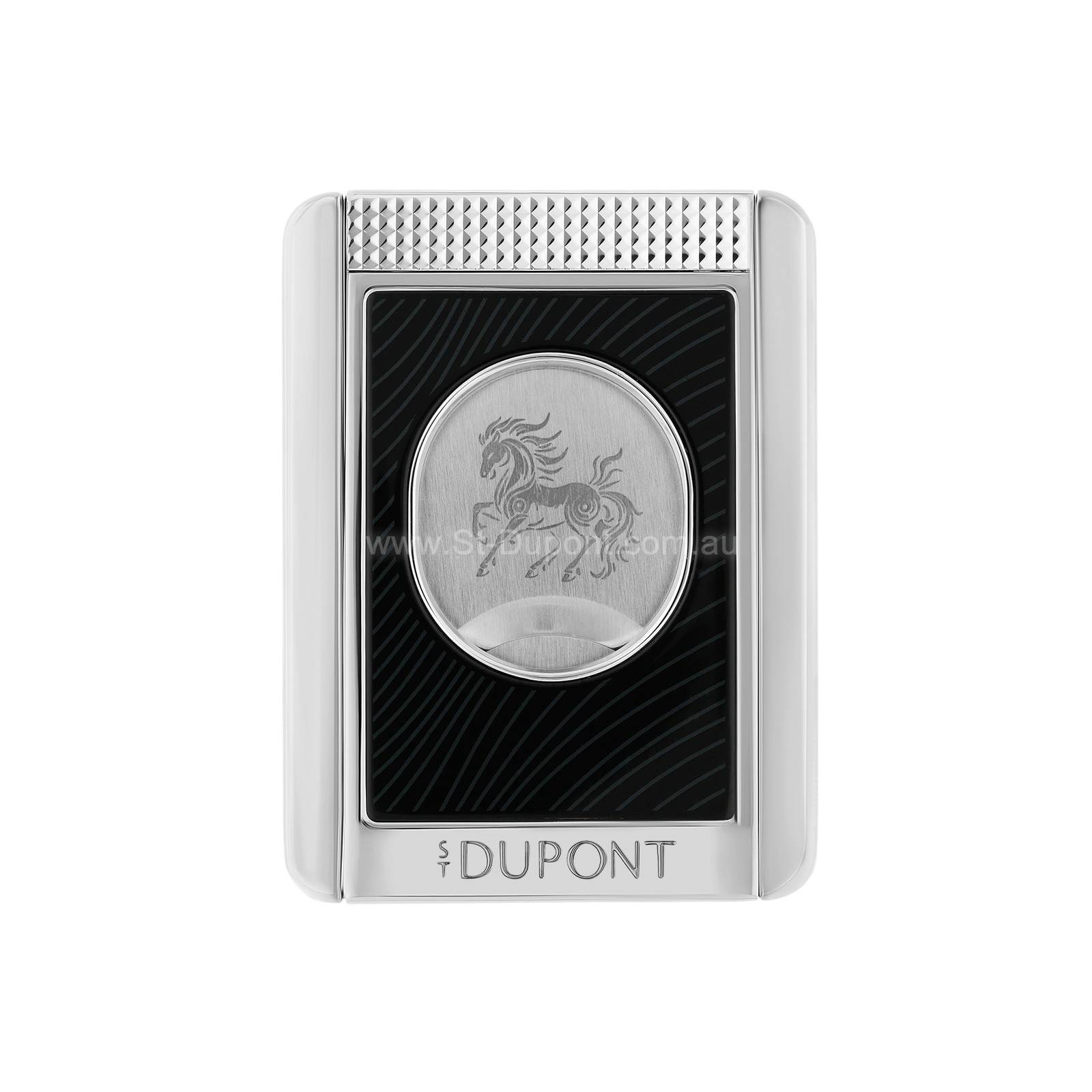 Cigar stand in high-gloss black lacquer, decorated with the “horse mane” motif. Blade engraved with the Fire Horse motif. Chrome-plated finish.